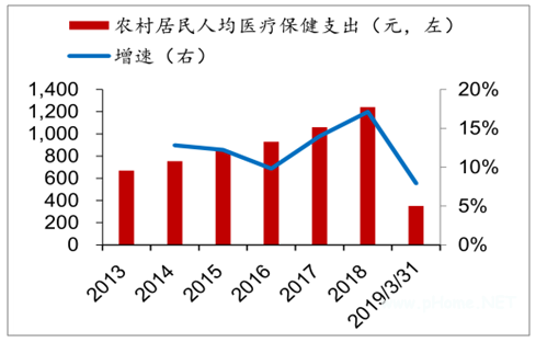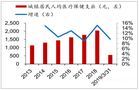 无论是城镇还是农村人口的医疗保健支出都在增长,其中城镇居民2018年人均医疗保健支出突破2000元,2019年1季度继续快速增长;农村居民2018年人均医疗保健支出突破1200元,增速高达17.12%,2019年1季度继续增长。