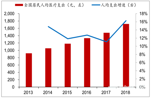 根据国家统计局数据,2013年以来全国居民人均医疗支出一直保持双位数增长,人们收入提升后,对健康将更加注重,其增长速度一直高于人均可支配收入,2018年人均支出1720元,增速高达16.29%。