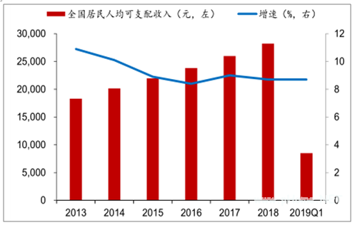 2013年以来在宏观经济增速放缓的背景下,全国居民人均可支配收入增速有所下降,但是始终高于GDP的增长,截止2018年全国居民人均可支配收入已经突破2.8万元,增速为8.7%。2019年1季度继续保持增长,增速为8.7%。
