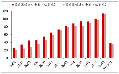 借助国家在医疗器械方面的鼓励政策,我国医疗器械产业取得了巨大的进步,产业结构正在优化,国内企业不仅在国内市场占有率正在提升,具备技术基础的一些产品已经开始向海外市场扩张。通过进出口数据来看,2006年以来医疗器械行业出口金额一直高于进口金额,2018年出口金额达到了114亿美元。但同时我们需看到,对于彩超、医用X射线仪、内窥镜、高端介入材料以及IVD领域的中高端产品仍以进口为主。