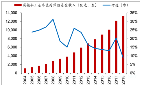 2004年以来,中国城镇职工基本医疗保险基金收入始终保持增长,2018年伴随宏观经济走弱,增速有所下移,但是2018年增速仍然高达8.7%。每年的绝对收入金额从2004年的1082亿元,上升至2018年的13259亿元。这是中国医药市场发展最强的支付力量。