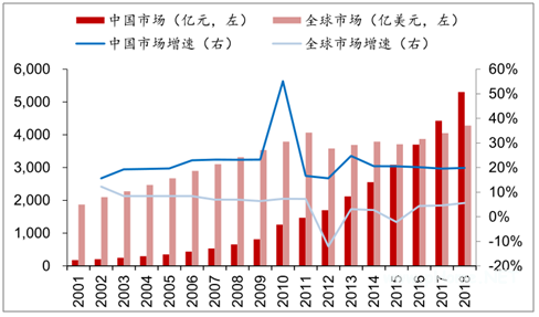 2001-2018年中国与全球医疗器械市场