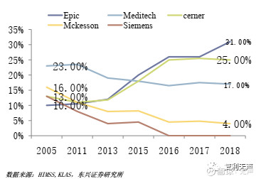 医疗IT数据研究公司KLAS统计出2018年美国三大医疗IT巨头EPIC、Cerner、Meditech分别占据美国医疗信息化行业28%、26%、16%的市场份额,共计70%。