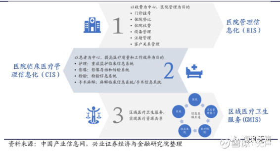即医院管理信息化(HIS)阶段,医院临床医疗管理信息化(CIS)阶段和区域医疗卫生服务(GMIS)阶段。