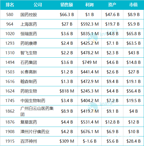 福布斯全球企业2000强榜单,14家家国内医药企业上榜